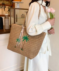 Japanese hand-woven bags, seaside vacation shoulder bags, large capacity tote bags, beach straw woven bags