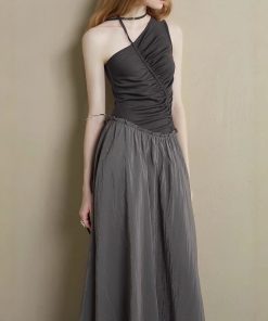 Original irregular splicing contrasting color pleated design feels slanted shoulder sleeveless dress