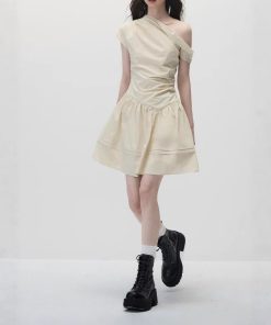 Original summer design and temperament, waist-hugging and slimming shoulder-shaped beige dress for women