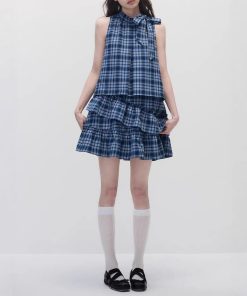 Sleepless Sea Summer blue checkered loose slim sleeveless ruffle cake dress for women