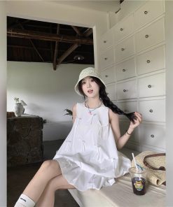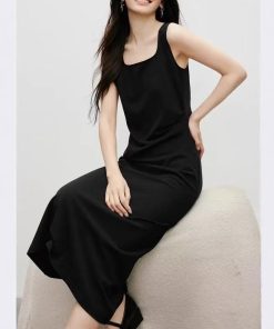 Spring women’s three-dimensional press-pleated waist-closed square collar pullover vest dress