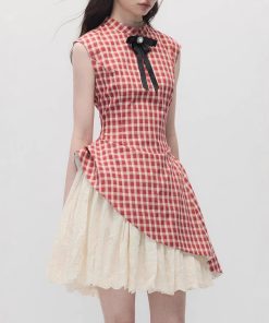 Strawberry cream pie, new Chinese style red plaid waist-hugging and slim small stand-up collar dress for women