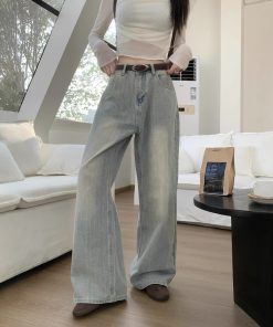 Real photo of fine lines retro washing jeans for women in spring high waist wide-leg pants
