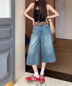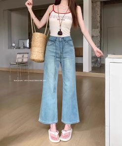 Real photo of American retro high street jeans for women in summer design high waist wide-leg cropped pants medium pants