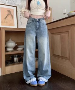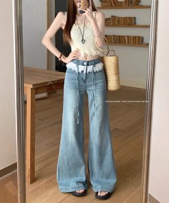 Real photo American retro lace splicing design wide-leg jeans women’s high waist slim floor trousers spring
