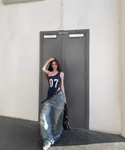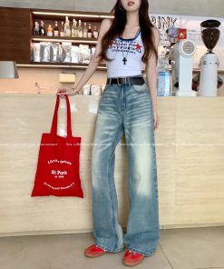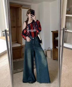 Real shot American retro hot girl ripped jeans women’s summer loose wide-leg floor trousers