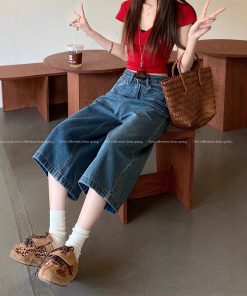 Real shot ~ loose wide-leg 7-cropped jeans for women in summer high waist relaxed lazy windbreaker pants medium pants