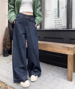 Real shot of autumn and winter retro nostalgic loose wide-leg casual pants for women with rosy big trousers legs denim floor trousers