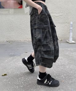 Real shot of American retro camouflage denim cropped pants for women in summer hot girls high waist loose work shorts