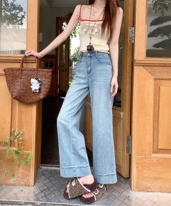 Real shot American retro press-line wide-leg jeans for women’s summer high waist design loose pinch pants
