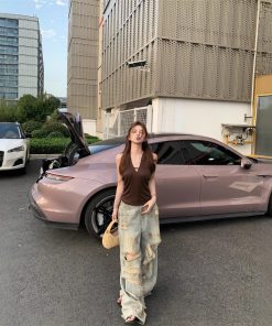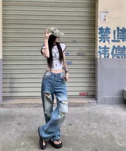 Real shot of halter neck and neck strap top for women heavy industry ink splashing old retro ripped jeans floor trousers