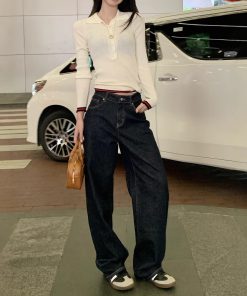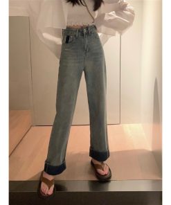 Real shot of blue high-waisted retro loose wide-leg pants for women’s side stitching and rolling versatile jeans