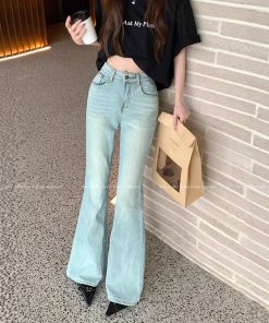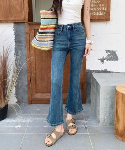 Real shot of denim blue jeans for women in spring high waist retro versatile casual pants trousers