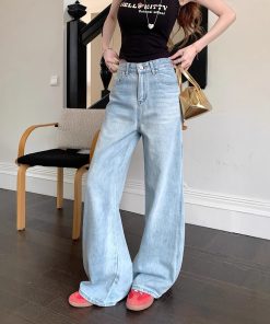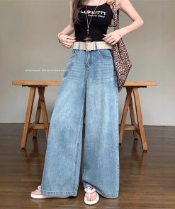 Real shot of retro high waist wide-leg jeans for women in spring and summer loose slim and lazy drooping floor trousers