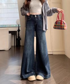 Real shot of Hong Kong style retro elastic wide-leg swaying jeans women’s high waist temperament trousers long trousers