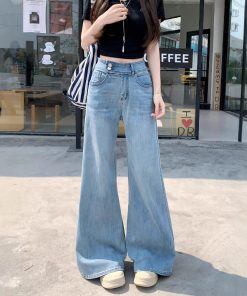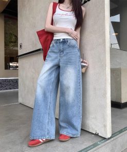 Real-life photo of loose and slimming water washing blue-padded floor jeans for women casual and versatile wide-leg pants