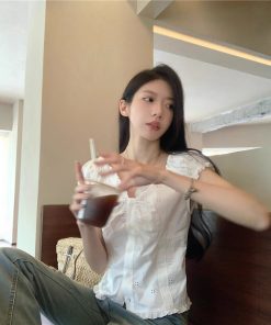 Real photo of summer off-white shirt for women puff sleeve collar one shoulder lace waist-hugging shirt short top