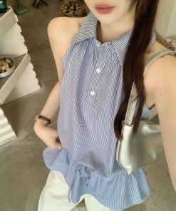 Real photos of summer Korean temperament plaid shirt top drawstring slimming and reducing age-reducing versatile loose-edged vest for women