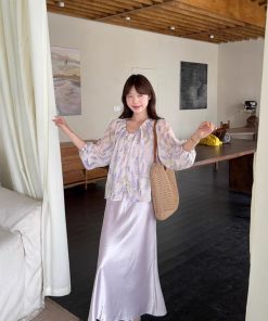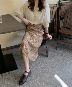 Real photo of summer neck loose retro lace shirt top + high waist slim floral skirt