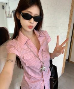 Real photos of summer pink striped shoulder-pinch waist-cut design shirt short-sleeved top versatile
