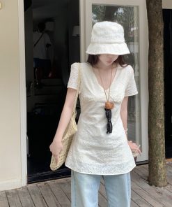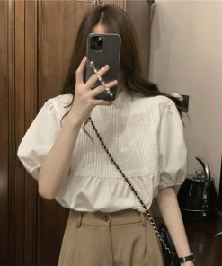 Real shot of summer white puff sleeve shirt for women in women’s French retro gentle round neck temperament short-sleeved top