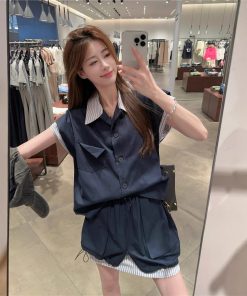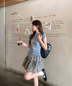 Real shot of sweet suit women’s summer blue pleated sleeveless top with high waist stand-up bud skirt two-piece set