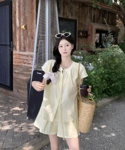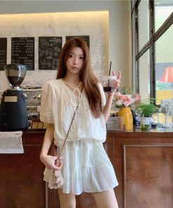 Real shot~ Sweet Korean style loose lace-up short sleeve shirt wide-leg shorts small fashion suit