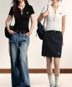 Original college style Henry collar slim knit top for women with short sleeve neckline slim waist slim knit top