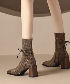 Kanaigu Temperament style ~ Square-toed houndstooth Martin boots for women with autumn bow thick high heels