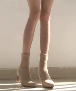 Nude suede elastic boots for women in autumn and winter color-blocking thick heeled mid-tube short boots rear zipper high heel Martin boots
