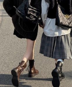 Retro British square-toe soft leather Martin boots for women’s autumn short boots tied mid-tube knight western denim boots