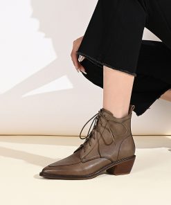 Retro French pointed-toe short boots for women’s middle heel lace-up Martin boots for autumn and winter women’s boots thick heel soft leather ankle boots