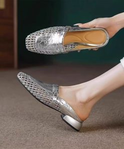 French retro square-toe hollow woven thick heel shoes for women with one foot, casual half slippers for women