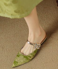 New Chinese style jacquard rhinestone low heel half slippers for women in summer one-line thick heel pointed toe lazy bag-toe sandals