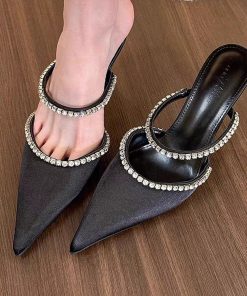Rhinestone one-line shallow mouth high heels fashionable simple spring and summer pointed toe slim heels mid-heel half slippers for women