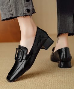 British style retro low heel small leather shoes for women with soft leather autumn square toe deep mouth shoes one foot pedal shoes