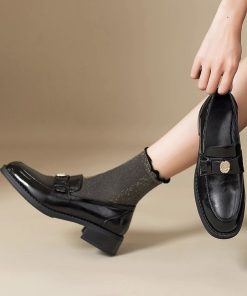 British retro shoes thick sole badge small leather shoes for women in autumn and winter soft leather niche college style black thick heel single shoes