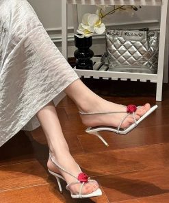 One-strip sandals for women French style pearl rhinestone square sandals for women summer fashion high heels