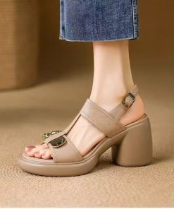 Thick heel sandals for women in summer soft leather high heels casual simple thick sole small height-enhancing shoes
