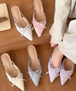Thick heel bow bag half slipper fairy shoes spring and summer satin French temperament half-scroll single shoes