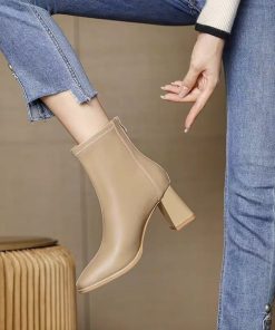White short boots for women plus fleece this year’s popular boots for fashionable square toe thick heel leather boots to make women look slim French high heel boots