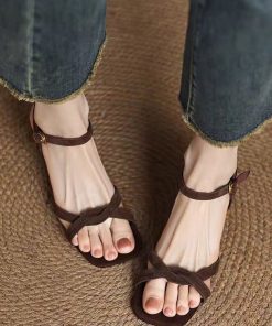 Feeling of stinging ~ French minimalist small soft leather crossed with round toe simple shoes thick sole thick heels open-toe sandals for women