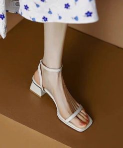 French minimalist style open-toed sandals for women in summer medium thick heel soft leather commuting square head one-liner high heels with skirt