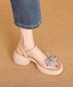 Temperament rhinestone bow thick sole silver open-toed sandals for women in summer fairy style thick heel shoes