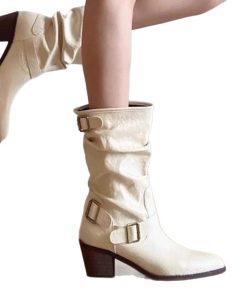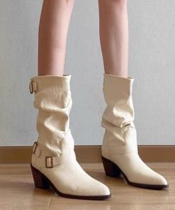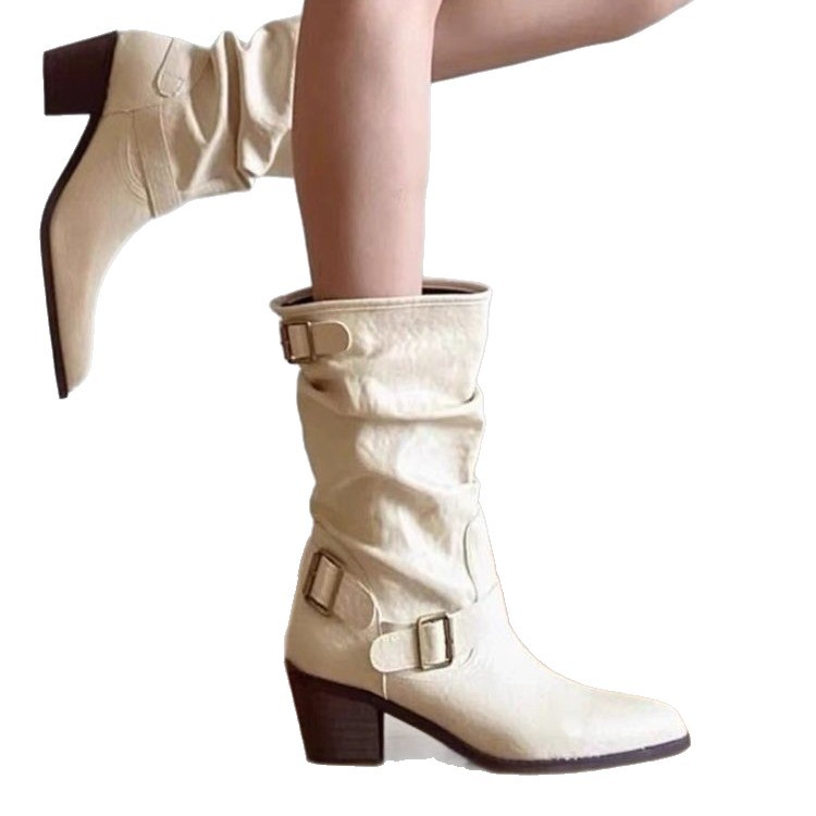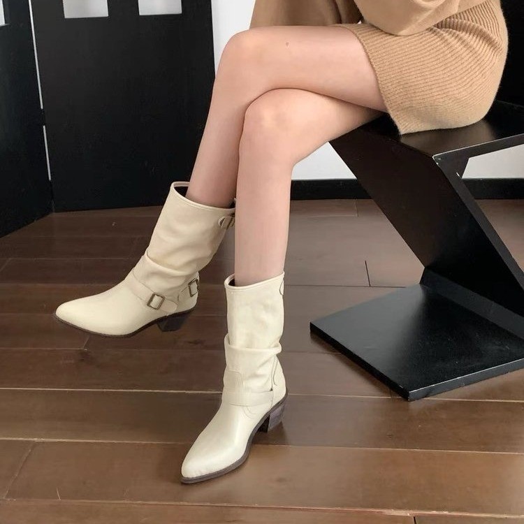 Boots for women’s summer high-end leather belt buckle Martin boots pointed toe thick heel pile boots Western denim boots