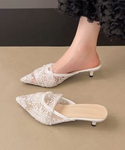 French mesh breathable half-slippers for women in summer wear with skirt sandals pointed toe low-heeled sandals