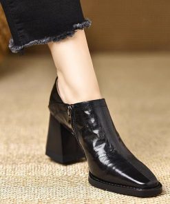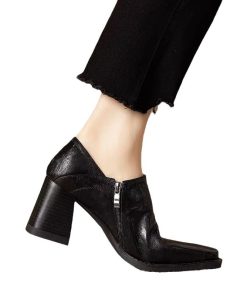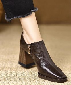 French retro soft leather square-toe high heels for women’s spring and autumn brown thick heels deep mouth side zipper single shoes