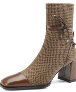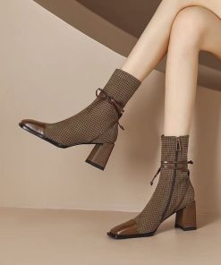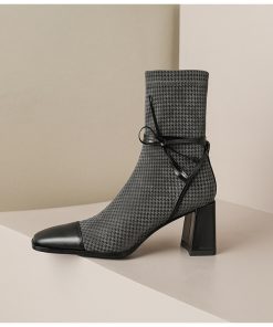 Kanaigu Temperament style ~ Square-toed houndstooth Martin boots for women with autumn bow thick high heels