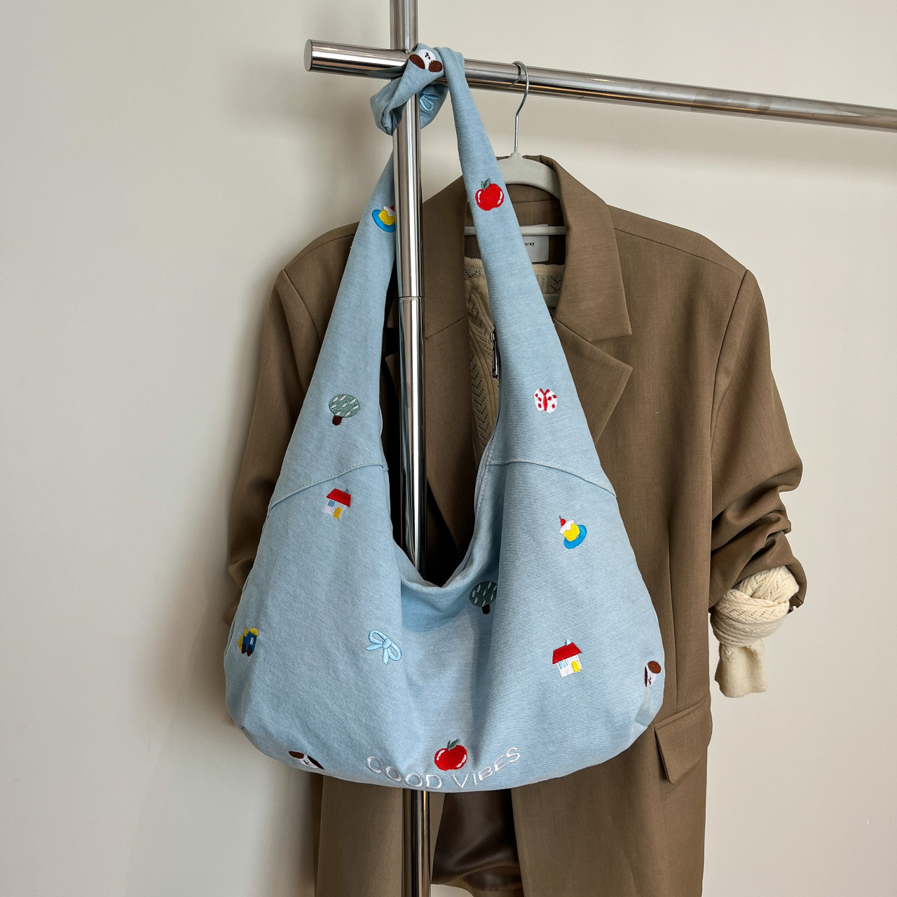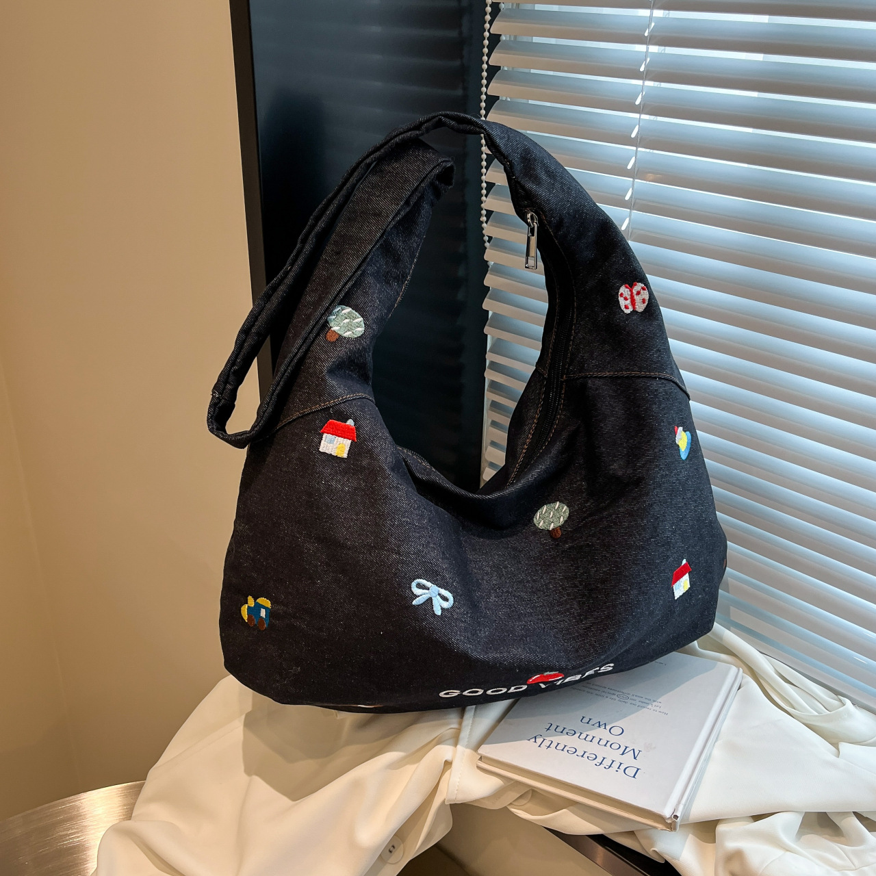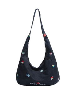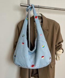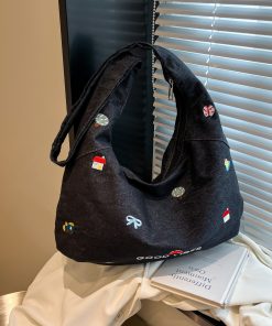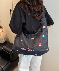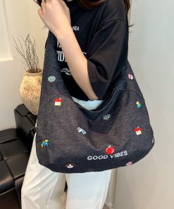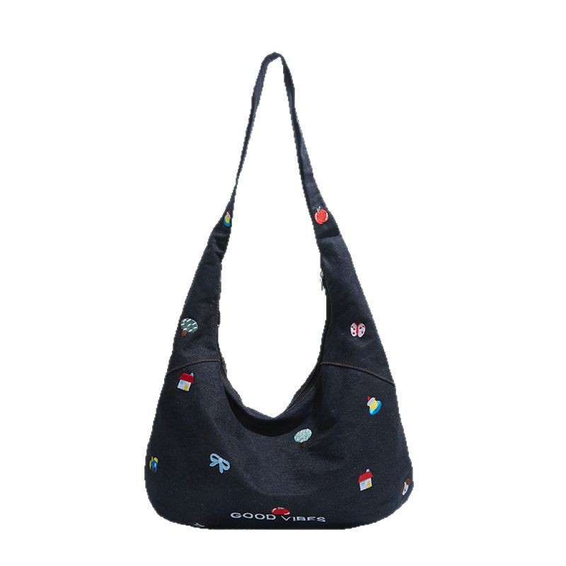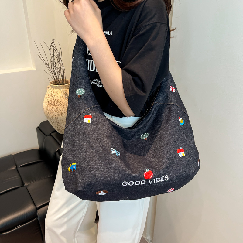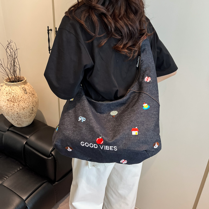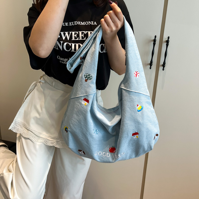 Korean embroidered denim crossbody bag for women niche large capacity commuting one-shoulder tote bag
