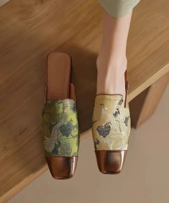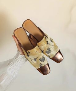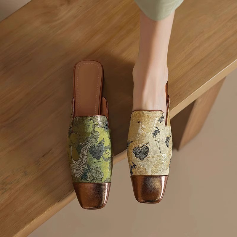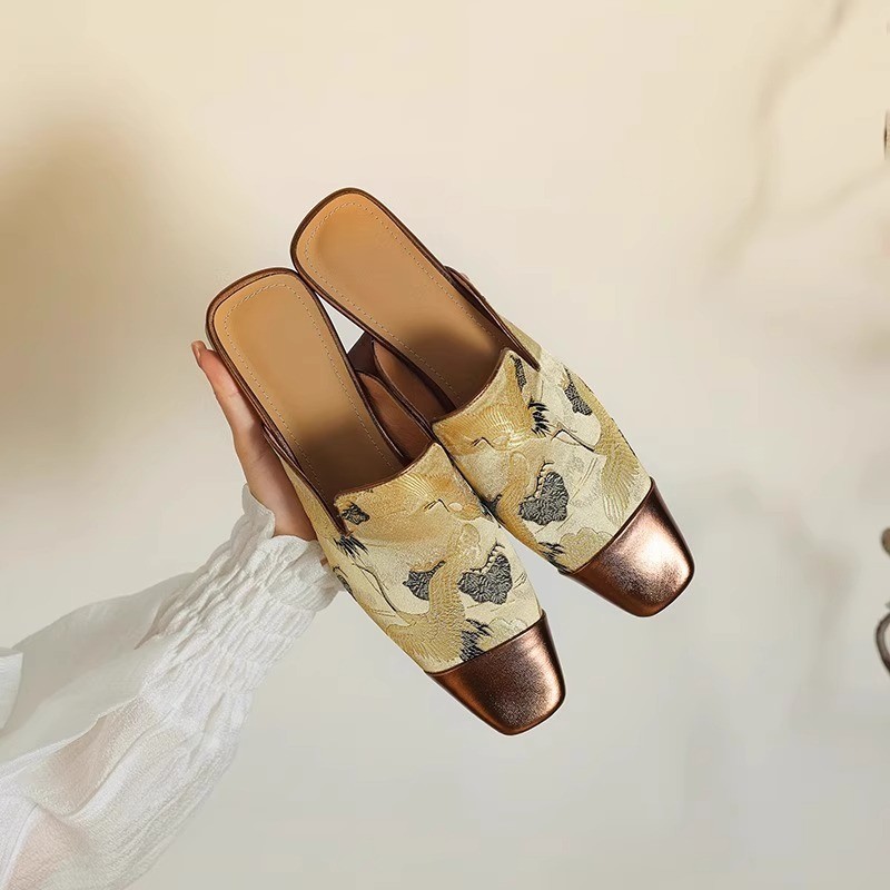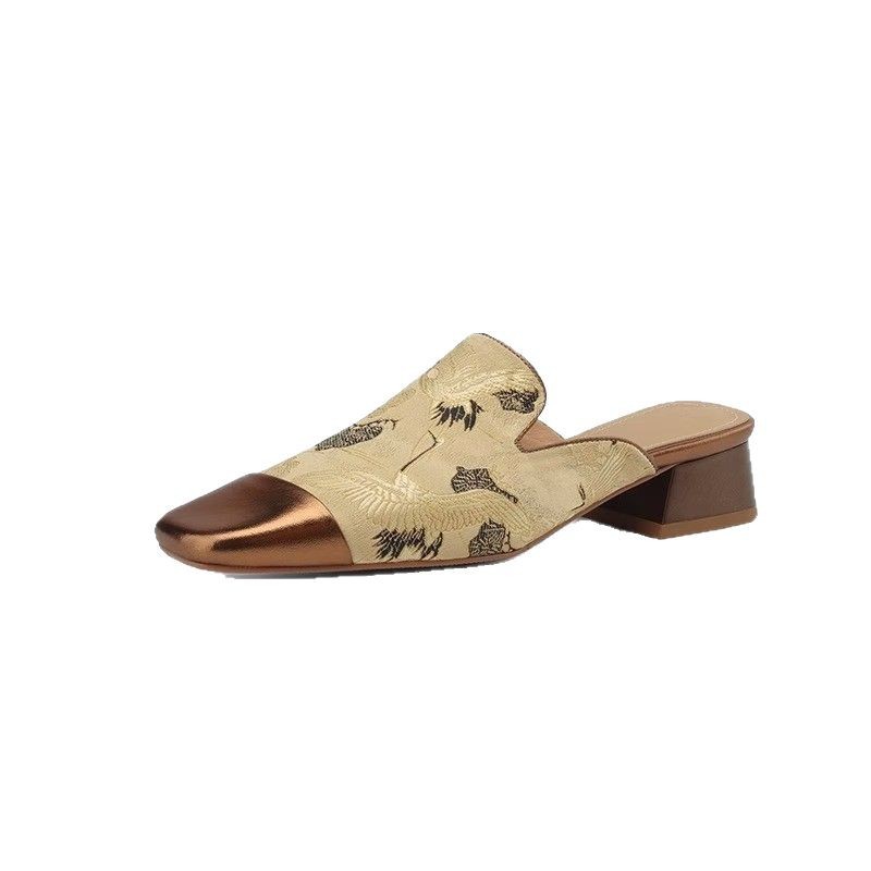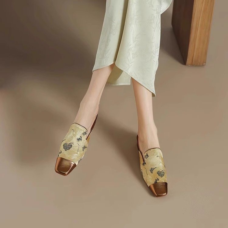 New Chinese style Chinese style half-slippers for women with embroidered thick heels high-end low-heel color-blocking muller sandals with skirt
